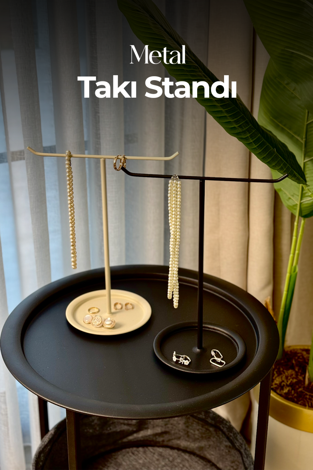 Metal takı standı, dayanıklı metal malzemeden üretilmiş olup, uzun ömürlü bir kullanım vaat eder. Ürün, üst kısımda asma çubuğu ve alt kısımda yuvarlak bir tabanla tasarlanmıştır. Bu tasarım, kolye, bileklik, küpe ve yüzük gibi çeşitli mücevherleri rahatça yerleştirmenize imkan sağlar.