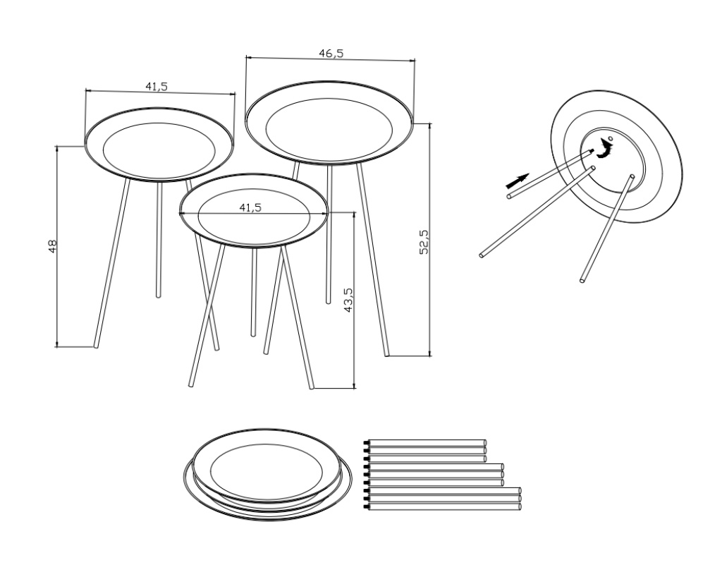 • Büyük sehpa: 46,5 cm çap, 52,5 cm yükseklik