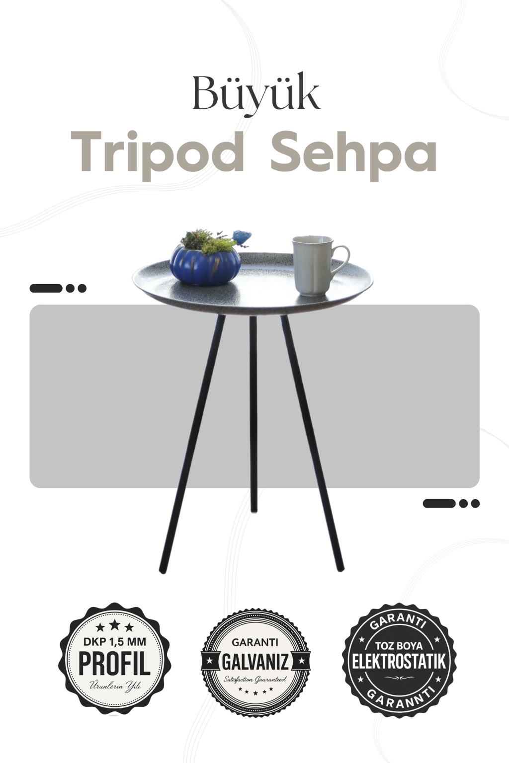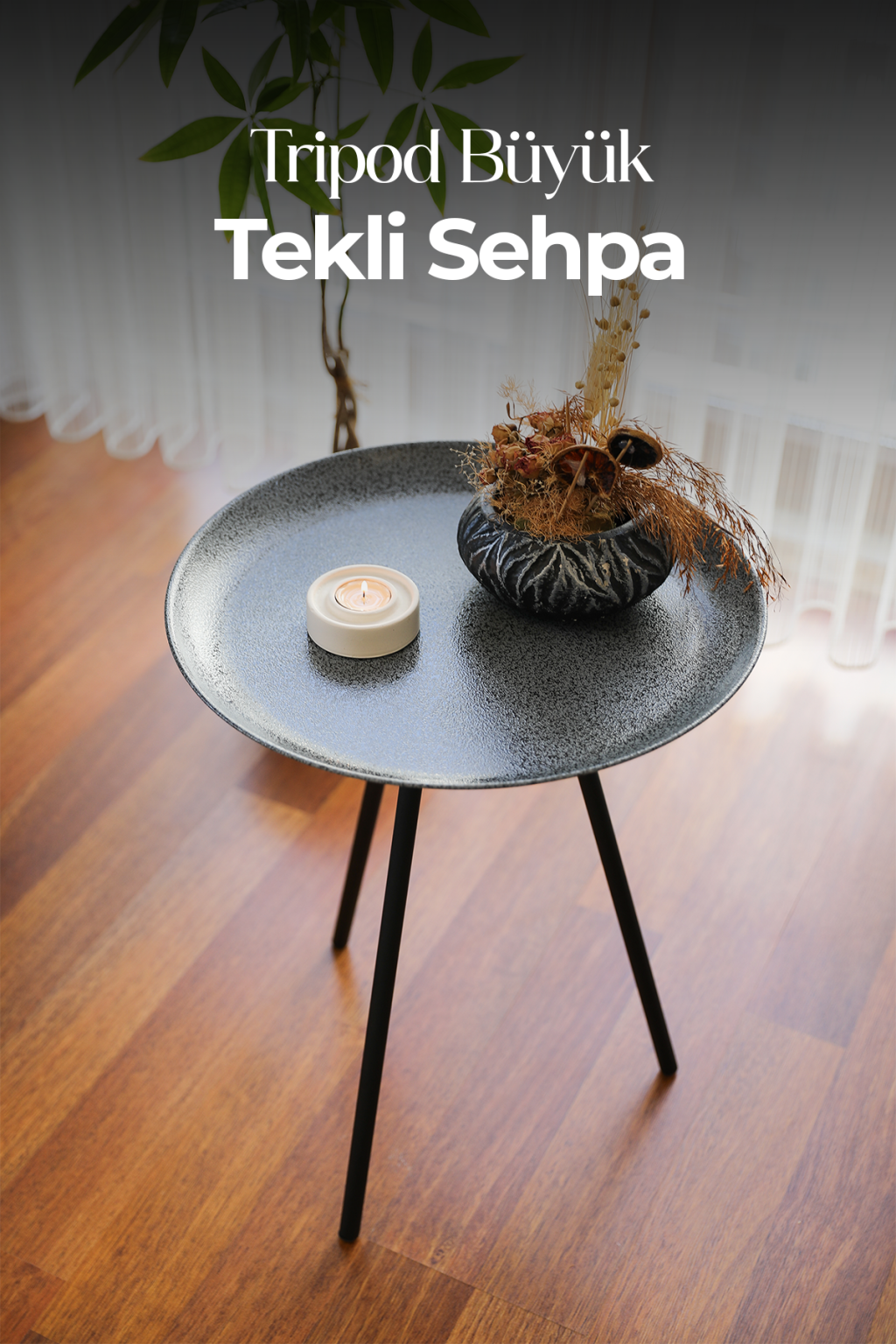 Resimdeki tripod sehpa, koyu gri tonlarıyla nötr bir renk paleti sunar. Bu renk, hemen hemen her iç mekan stiline uyum sağlar. Ev dekorasyonu yaparken renk uyumu çok önemlidir. Örneğin, bu sehpa siyah deri koltuklarla veya beyaz kanepelerle harika bir kontrast oluşturur. Minimalist mobilya sevenler için ideal bir tamamlayıcıdır.